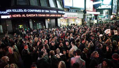 5月2日,人們?cè)诩~約時(shí)報(bào)廣場(chǎng)慶;亟M織頭目本·拉丹被擊斃。
