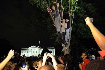 5月1日深夜,白宮門(mén)前歡慶的人們,不少人爬上樹(shù)枝