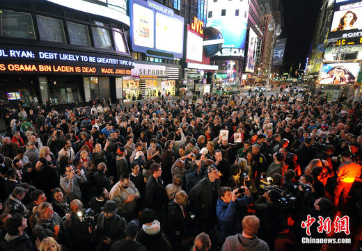 美國(guó)總統(tǒng)奧巴馬1日晚突然召開(kāi)記者會(huì),正式宣布基地組織頭目本·拉登已經(jīng)死亡。在奧巴馬發(fā)表演講前后,許多美國(guó)民眾已高舉國(guó)旗聚集到時(shí)代廣場(chǎng)附近,他們高呼口號(hào),慶祝拉登之死。