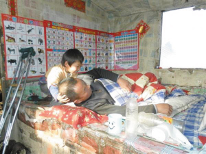 當(dāng)時(shí)孫躍民的身體很好,他把家里僅有的10多畝承包地轉(zhuǎn)包以后,還了一部分債,然后進(jìn)城打工,不管活兒多臟多累多危險(xiǎn),只要給錢多他就干。災(zāi)難卻偏偏再次降臨到這個(gè)風(fēng)雨飄搖的家庭。2011年7月26日,孫躍民在哈爾濱工業(yè)大學(xué)挖地溝,4米多高的深坑突然塌方,把他整個(gè)人埋了進(jìn)去,造成胯骨骨裂、七根肋骨骨折、心臟主動(dòng)脈受損、肺損傷等,在醫(yī)院搶救了20多天,花去了16萬(wàn)多元。之后,工頭兒不再出錢,最后只給了孫躍民6萬(wàn)元。就這樣,拖著一雙斷腿、骨盆粉碎,渾身是傷的孫躍民被抬回了家,和詹娟一樣,癱在了床上?墒牵蠈(shí)本分的孫躍民回家的第一件事兒,就是把6萬(wàn)元都用來(lái)還債,最后仍然剩下1萬(wàn)多元的債。