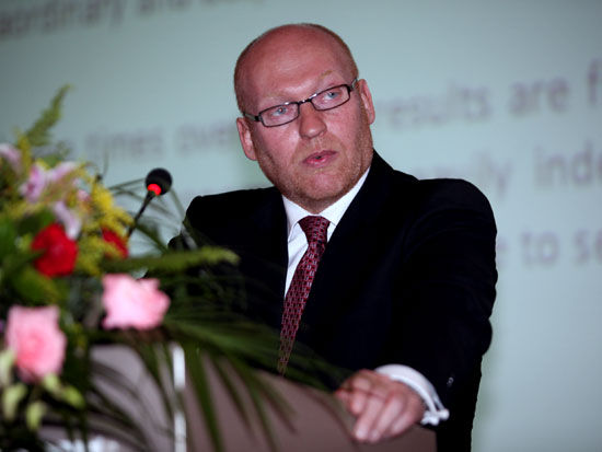 “世界產(chǎn)業(yè)領(lǐng)袖大會(huì)”于2011年9月5日在吉林省長(zhǎng)春市隆重舉行。上圖冰島議會(huì)議員特里格維。(圖片來(lái)源:新浪財(cái)經(jīng) 梁斌 攝)