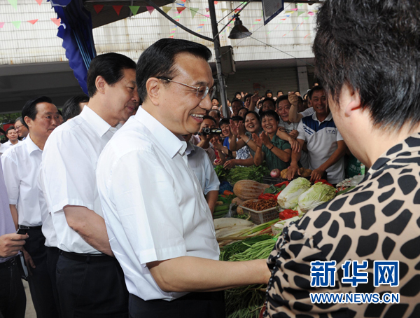 桐城市和平農(nóng)貿(mào)市場(chǎng)里,農(nóng)副產(chǎn)品琳瑯滿目。李克強(qiáng)沿著長(zhǎng)長(zhǎng)的攤位,一邊察看一邊與群眾交談,詢問(wèn)肉禽蛋菜等的價(jià)格和銷(xiāo)售情況。他指出,在大力增加農(nóng)產(chǎn)品生產(chǎn)的同時(shí),要進(jìn)一步疏暢流通渠道,降低流通成本,保證“米袋子”、“菜籃子”等群眾生活必需品供應(yīng),保持物價(jià)總水平基本穩(wěn)定。