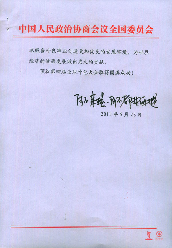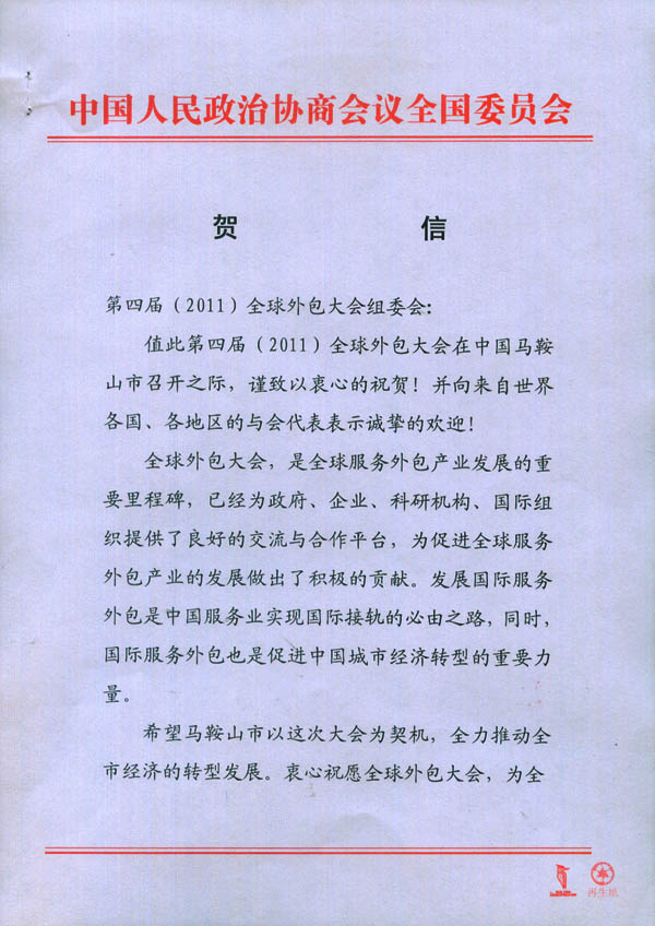 賀 信 第四屆(2011)全球外包大會(huì)組委會(huì): 值此第四屆(2011)全球外包大會(huì)在中國(guó)馬鞍山市召開之際,謹(jǐn)致以衷心的祝賀!并向來自世界各國(guó)、各地區(qū)的與會(huì)代表表示誠(chéng)摯的歡迎! 中國(guó)人民政治協(xié)商會(huì)議全國(guó)委員會(huì)副主席