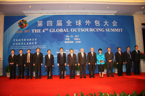 第四屆全球外包大會(huì)開幕式主席臺(tái)嘉賓見證合作文本交換儀式并合影