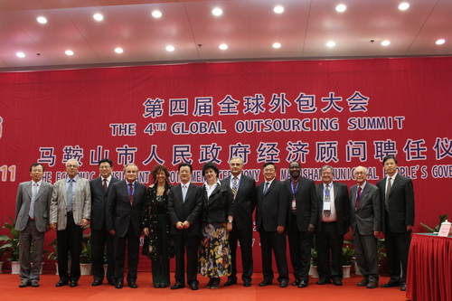 馬鞍山市市長(zhǎng)張曉麟在第四屆全球外包大會(huì)前與新聘任政府經(jīng)濟(jì)顧問(wèn)合影