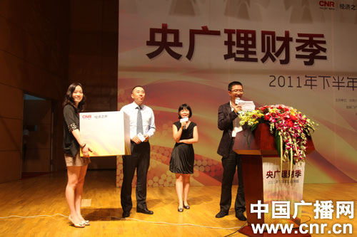 “央廣理財季”17日隆重起航,以2011年下半年投資策略為主題;顒蝇F(xiàn)場將以貼近民生的理財話題為主題,以聽眾+專業(yè)理財嘉賓+經(jīng)濟之聲王牌主持的現(xiàn)場交流互動為形式,為聽眾與專家搭建零距離互動交流平臺。圖為益盟都業(yè)華(左二)為此次活動抽取三等獎。( 中廣網(wǎng)記者任芳 攝)