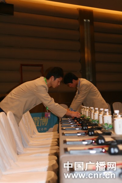 博鰲亞洲論壇會員大會召開前,服務(wù)人員正在做最后的準(zhǔn)備工作。圖為同傳設(shè)備已擺放整齊。中廣網(wǎng)記者祁亞楠攝