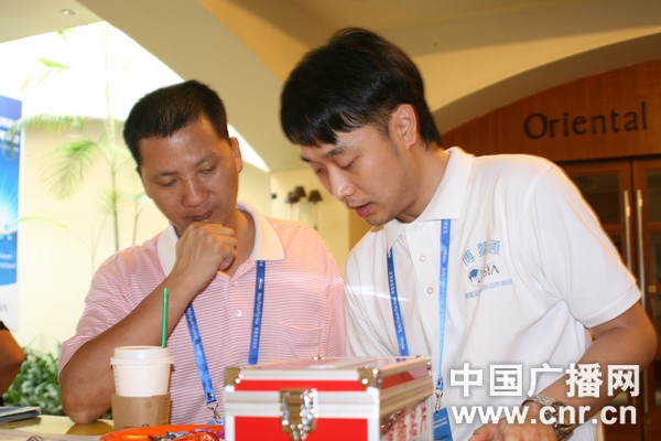 博鰲亞洲論壇邁入無線互聯(lián)網時代,參會記者及嘉賓可以在蘋果或安卓系統(tǒng)的智能手機上安裝應用程序,第一時間接收論壇日程更改消息及相關通知。圖為工作人員向參會記者介紹“博鰲通”的使用方法。 中廣網記者祁亞楠 攝
