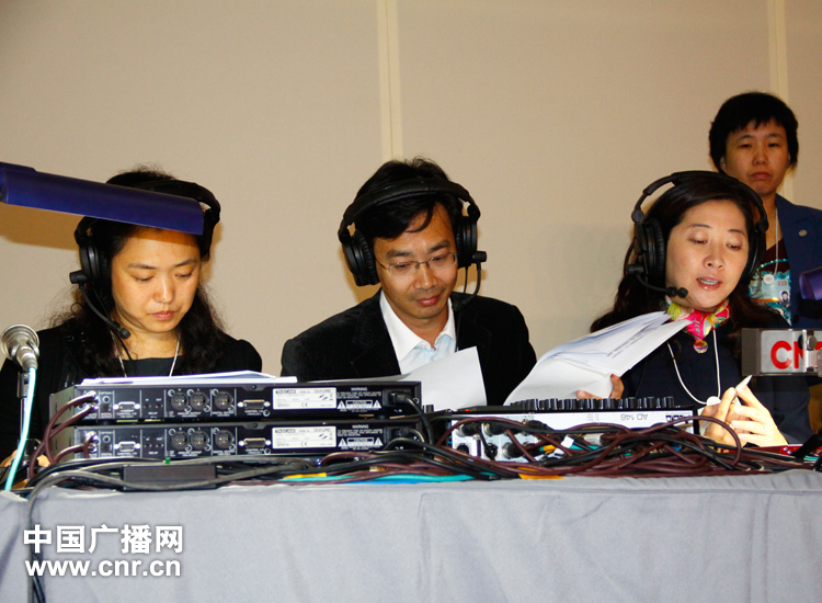 中央臺(tái)主持人龐瑩、楊波和特約評(píng)論員吳學(xué)蘭正在直播2011夏季達(dá)沃斯開幕式