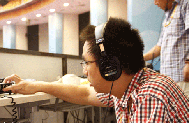 中央臺總編室主任潘曉聞正在與后方人員溝通