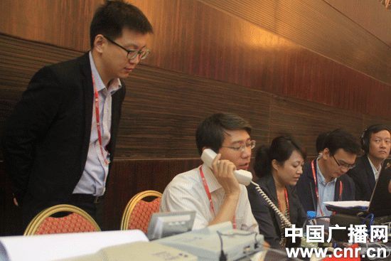 中央臺(tái)總編室潘曉聞(左二)主任在直播前與后方人員溝通
