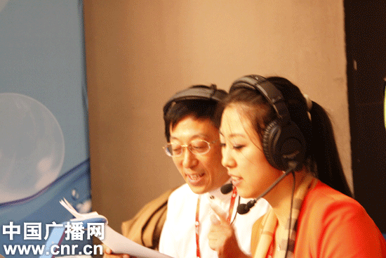 中央臺(tái)主持人朱衛(wèi)東(左)與廣西臺(tái)主持人程雪直播第九屆中國(guó)-東盟博覽會(huì)開(kāi)幕式
