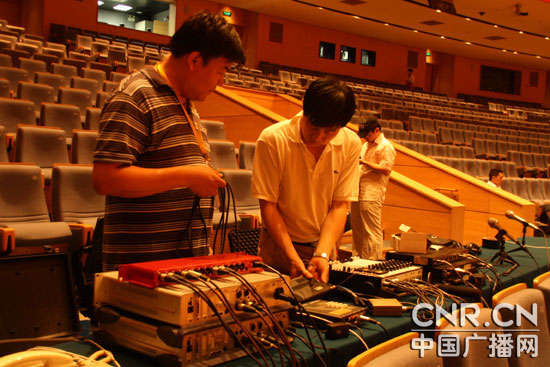 第二屆海峽論壇直播現(xiàn)場(chǎng),工作人員正在調(diào)試設(shè)備