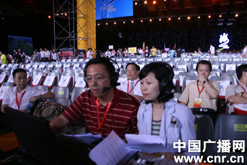 第三屆海峽論壇開幕式暨文藝晚會(huì)現(xiàn)場(chǎng),中央臺(tái)主持人在為直播做準(zhǔn)備-圖為主持人賈旭東(左)杜月媚