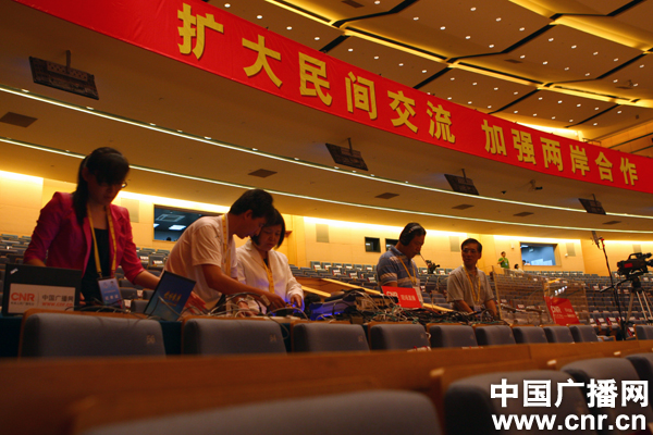 第四屆海峽論壇,中央人民廣播電臺工作人員在調(diào)試設(shè)備(中廣網(wǎng)記者 李雪南攝)