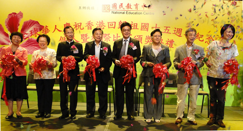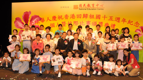 2012年是香港回歸祖國十五周年,為與全球華人一同慶祝香港回歸祖國十五周年盛事,國民教育中心于二月開始主辦“全球華人慶祝香港回歸祖國十五周年紀念”個人暨校際比賽,活動包括全球華人心意咭設計比賽(公眾組)、攝影比賽(中學組)、硬筆書法比賽(小學組)及情濃親子填色比賽(幼兒園組及特殊學校組)。經(jīng)過評審嚴謹評核,最終從各組別選出冠亞季軍及優(yōu)異獎,并設有積極參與獎鼓勵學校推動學生參與。此次比賽反應踴躍,收到作品總數(shù)接近二千份,參與的中、小學、幼兒園及特殊學校超過170間。大部份作品表現(xiàn)出色,別具風格,充份表達對香港回歸的喜悅。