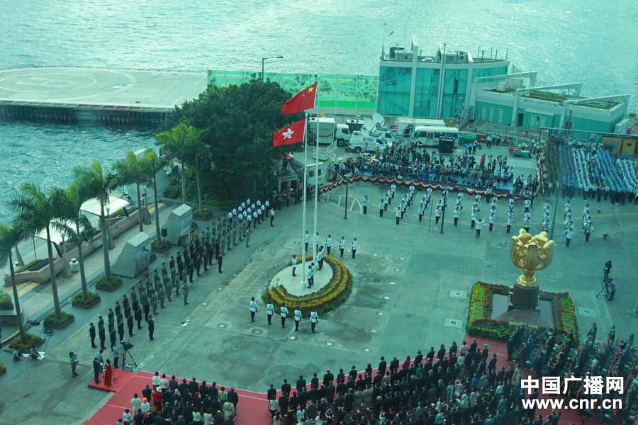 7月1日上午8時(shí),香港特區(qū)在金紫荊廣場(chǎng)舉行升旗儀式。(中廣網(wǎng)記者 陳鐘 攝)