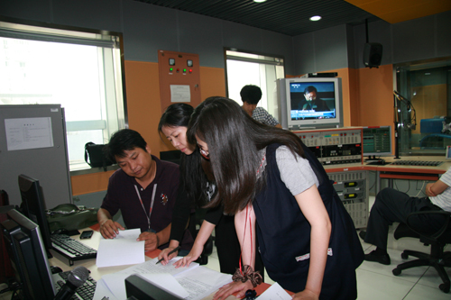 華夏之聲副總監(jiān)胡翼(左一)認真核對節(jié)目流程