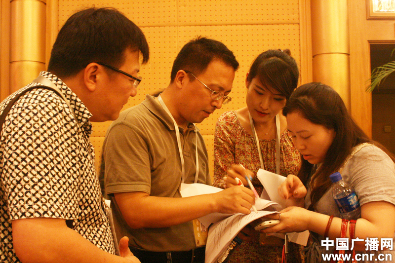 中央人民廣播電臺直播人員在會議現(xiàn)場準(zhǔn)備,確保直播工作萬無一失。(中廣網(wǎng)記者 安紅麗 攝)