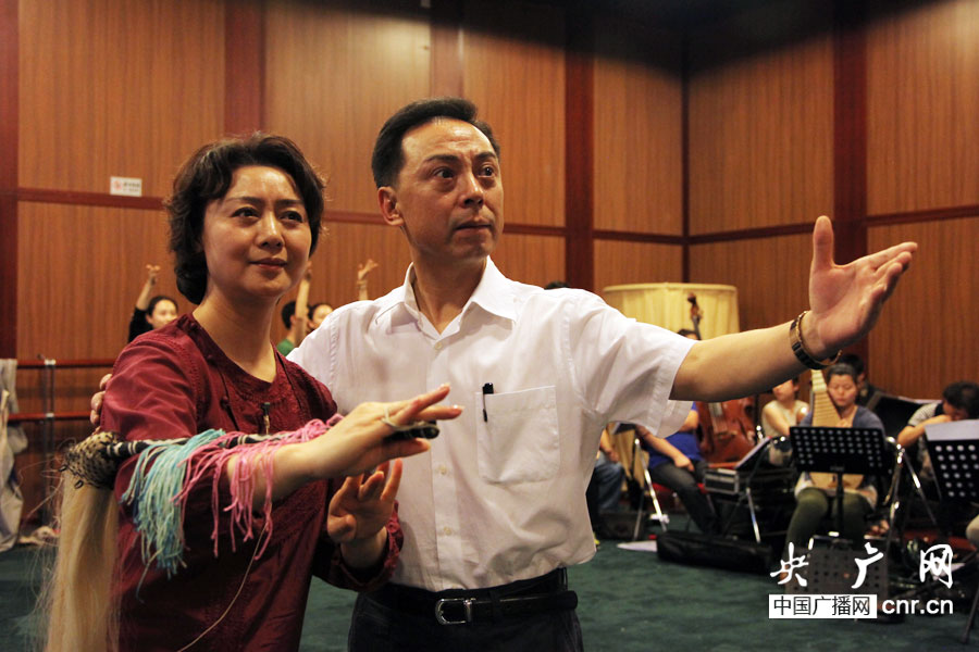 京劇表演藝術(shù)家于魁智、李勝素正在排練當(dāng)中(央廣網(wǎng)記者 趙娜娜 攝 )