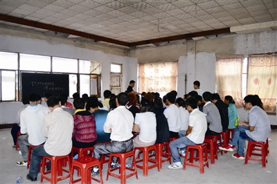 當(dāng)日下午,記者在現(xiàn)場(chǎng)看到,該會(huì)議室十分破舊,里面掛了一塊黑板,放了一張講桌,所有聽(tīng)課人員均坐在塑料凳上。