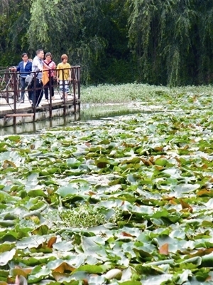 湖心島北面的玉帶橋由8塊長方形橋板按“Z”字形組合而成,如一條菱形的玉帶鑲嵌在湖中,連接湖心島和柳堤。柳堤直通湖岸的回廊,堤兩側(cè)的楊柳樹下有供休憩和垂釣的石凳,閑暇時或漫步柳岸或垂釣樹下,微風(fēng)徐來,千條柳枝隨風(fēng)飄舞,別有一番風(fēng)味。蕭瑟的晚秋,湖面升騰的水氣在初生月光的照映下煙波浩渺,更有“楊柳岸曉風(fēng)殘月”的凄清之美。柳堤中央有一座34根石雕立柱的平曲橋,橋孔較高,橋面弧度小,正面望去宛如一座水上城門。鴛鴦湖東面的水上步道獨具特色,從護(hù)欄到路面全由松木搭建而成。以此為界,公園東面是一片荷花塘,碧綠的海洋中一朵朵潔白的荷蓮?fù)ねび窳ⅲL(fēng)度翩翩。