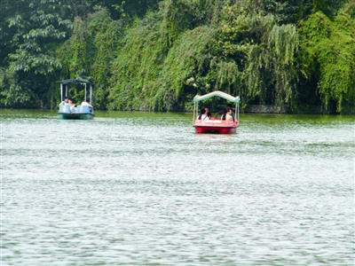 鳳池水域分為兩部分,西面是供游人游湖的“情侶灣”。藍(lán)天碧水,惠風(fēng)和暢,泛舟其間,聆聽船槳和水花的協(xié)奏,讓人心曠神怡,悠然自得。水域東面是兩湖合一的“鴛鴦湖”,一前一后,相依相伴,仿佛是一對纏綿的鴛鴦。
