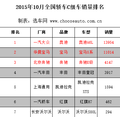 2015年10月全國(guó)C級(jí)車(chē)銷(xiāo)量排名(部分)