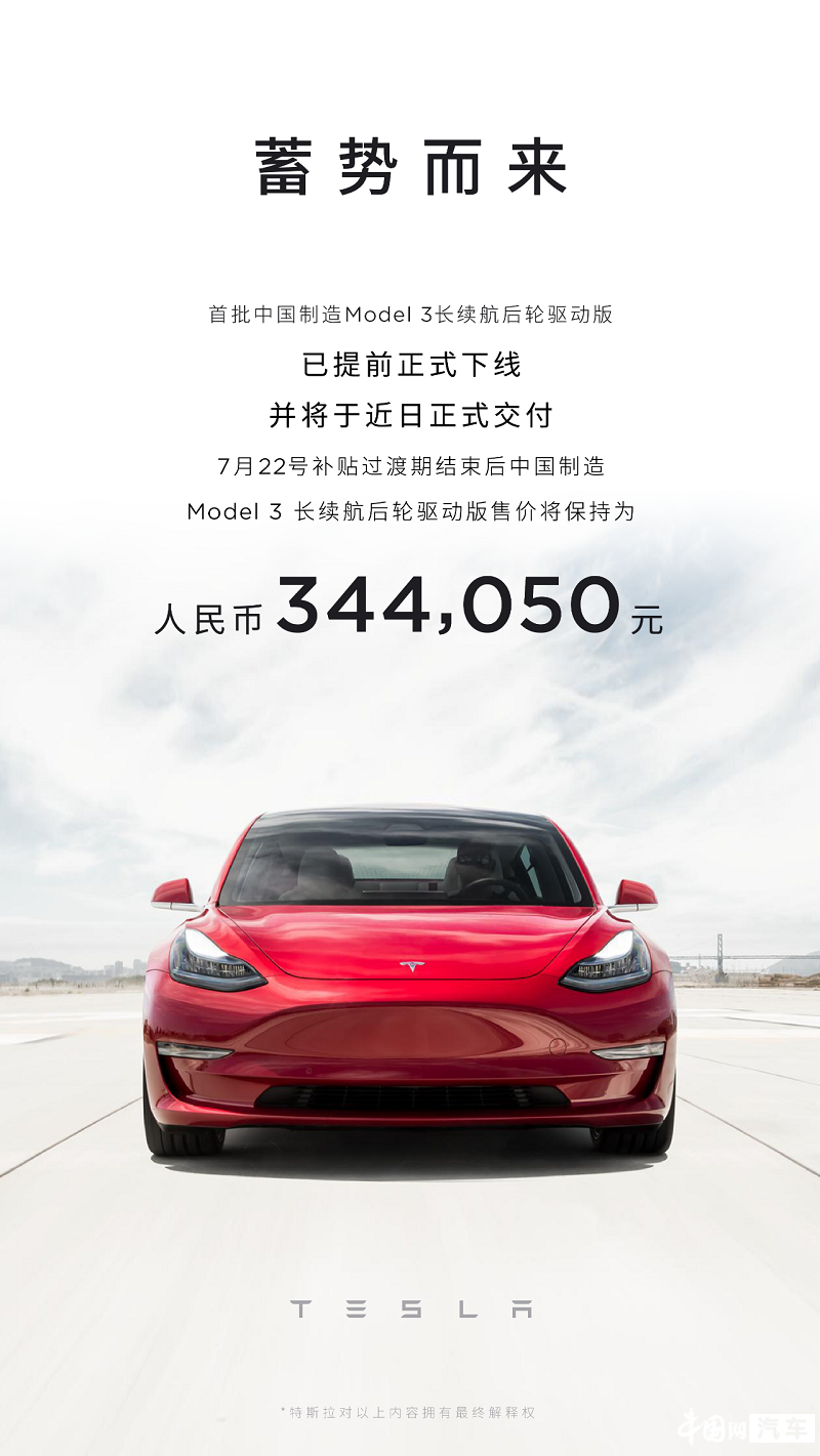 此外,根據(jù)政策新政規(guī)定,國產(chǎn)版特斯拉Model 3長續(xù)航后驅(qū)版車型售價(jià)超過了30萬元,在7月22日過渡期結(jié)束后,該車將不享受補(bǔ)貼。對(duì)此特斯拉官方強(qiáng)調(diào),過渡期后,國產(chǎn)Model 3長續(xù)航后驅(qū)版車型售價(jià)不變,將保持34.405萬元。
