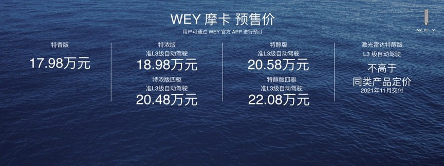 2021年4月19日,“智動(dòng)WEY來(lái)”WEY品牌“摩卡”預(yù)售發(fā)布會(huì),在第19屆上海車(chē)展盛大舉行。WEY旗下首款率先應(yīng)用“咖啡智能”的全新旗艦車(chē)型摩卡,正式開(kāi)啟預(yù)售,全系共推出特香版、特濃版、特濃版四驅(qū)、特醇版以及特醇版四驅(qū)共五款車(chē)型,預(yù)售價(jià)格分別為17.98萬(wàn)元、18.98萬(wàn)元、20.48萬(wàn)元、20.58萬(wàn)元以及22.08萬(wàn)元,以觸手可及的價(jià)格,實(shí)力打造“全民爆款”。作為同級(jí)首個(gè)實(shí)現(xiàn)高階自動(dòng)駕駛的量產(chǎn)車(chē),摩卡將助力WEY加速布局智能出行領(lǐng)域,實(shí)現(xiàn)自我顛覆超越,讓科技洞悉人心。