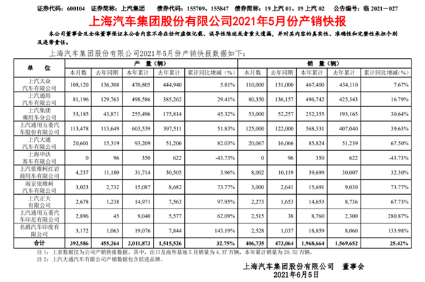 總體來看,2021年前5月,上汽大眾銷量同比增長7.67%、上汽通用銷量同比增長16.79%、上汽乘用車銷量同比增長30.64%、上汽通用五菱銷量同比增長39.63%,上汽大通銷量同比增長67.50%。