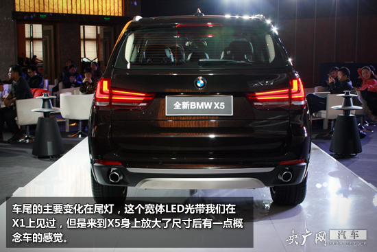 車尾的主要變化在尾燈,這個寬體LED光帶我們在X1上見過,但是來到X5身上放大了尺寸后有一點概念車的感覺。