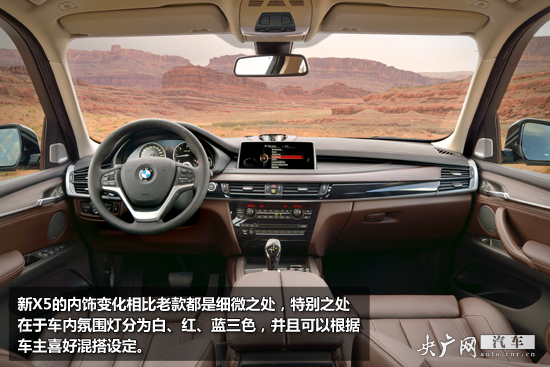 新X5的內(nèi)飾變化相比老款都是細(xì)微之處,特別之處在于車內(nèi)氛圍燈分為白、紅、藍三色,并且可以根據(jù)車主喜好混搭設(shè)定。選裝M套件還有令人振奮的M款方向盤配置,應(yīng)該說新X5內(nèi)飾配置更為開放了。