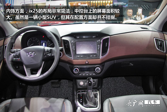 內(nèi)飾方面,ix25的布局非常簡潔,中控臺上的屏幕面積較大。雖然是一輛小型SUV,定位也比較經(jīng)濟,但其在配置方面卻并不拮據(jù),自動空調(diào)、一鍵啟動等配置都有裝備,優(yōu)勢還是相對來說比較明顯的。