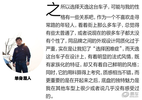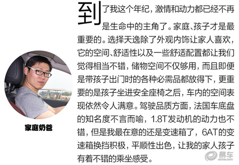 作為一款有顏值、有內(nèi)涵的法系城市SUV,天逸在很多方面的表現(xiàn)都算是不錯的,我自己也因為工作原因開過幾次,尤其是它的底盤調(diào)教可以說深得我心。而今天通過三位年輕的車主,從各自不同的角度談?wù)撨@臺車子,也著實讓我們可以對天逸有更進(jìn)一步的了解——除了駕駛,在外觀、配置、舒適性等各方面的出色表現(xiàn)。從編輯自身的角度出發(fā),僅憑駕駛感受方面的表現(xiàn),天逸就是一臺值得購買的車子,而結(jié)合三位消費者的觀點,在其他方面的表現(xiàn)又是否能夠滿足各位看官您的需求呢?