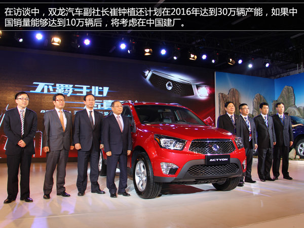 李裕一社長對未來銷量目標也進行了介紹,計劃明年全球銷量達到16萬輛,后年銷量達到20萬輛,中國銷量今年占全球銷量的7%,明年達到10%,后年依靠全新上市的小型SUV車型將要達到15%。并且目前雙龍產(chǎn)能在16萬輛左右,目標在2016年達到30萬輛產(chǎn)能,如果中國銷量能夠達到10萬輛后,將考慮在中國建廠。
