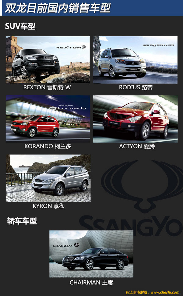 先前網(wǎng)上車市對雙龍汽車李裕一社長專訪獲悉,未來雙龍并沒有主席以下級別轎車研發(fā)考慮,并且雙龍依舊定位SUV領域。目前在國內擁有RODIUS 路帝、 REXTON 雷斯特W、ACTYON 愛騰、KORANDO 柯蘭多、KYRON 享御、CHAIRMAN 主席六款車型。