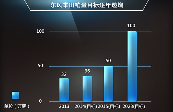 東風(fēng)本田在去年成立十周年之際,正式發(fā)布了名為“挑戰(zhàn)1+”的中期事業(yè)計劃,規(guī)劃2023年前成為年產(chǎn)銷100萬、累計1000萬客戶的企業(yè)。2013年,東風(fēng)本田銷量同比增長14%,全年達成321,440輛,創(chuàng)下企業(yè)成立十年來的最好成績,連續(xù)兩年實現(xiàn)10%以上的增長。今年上半年,東風(fēng)本田從139384輛同比提升23.3%至171860輛。隨著SUV車型的逐漸增多,東風(fēng)本田將在2015年迎來爆發(fā),產(chǎn)銷目標將躍升至50萬輛。