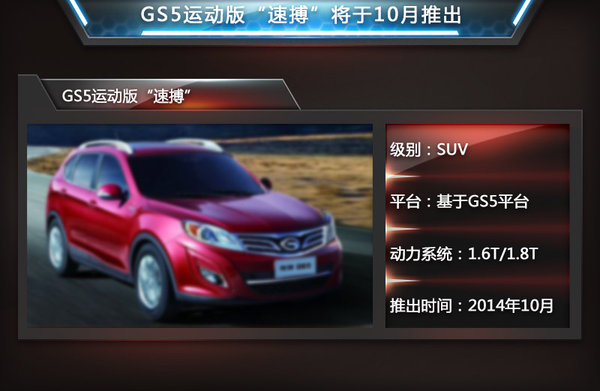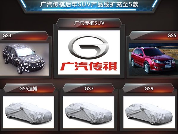 到2016年,廣汽傳祺還將推出基于傳祺GA7平臺(tái)打造的一款中大型SUV——GS7,此外,比GS7更大的全尺寸SUV車型GS9也將在同年發(fā)布。該兩款SUV將連同GS5、GS5速搏和GS3一起組成廣汽傳祺的SUV陣營(yíng)攻占SUV市場(chǎng)。