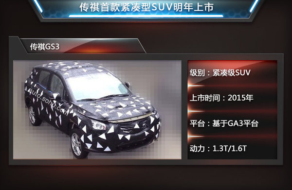 將于明年上市的傳祺GS3是廣汽傳祺首款緊湊型SUV,新車將采用GA3平臺(tái)研發(fā)制造,有望在2015年北美車展中首發(fā)。外觀方面,傳祺GS3車身身尺寸將于本田CR-V相仿,其前進(jìn)氣格柵的設(shè)計(jì)與GS5如出一轍,保險(xiǎn)杠則采用了大開(kāi)口的設(shè)計(jì)。動(dòng)力方面,廣汽傳祺未來(lái)將以渦輪增壓發(fā)動(dòng)機(jī)為主,按照計(jì)劃,1.3T和1.6T發(fā)動(dòng)機(jī)將于2014年投入使用,其中1.3T發(fā)動(dòng)機(jī)將率先在GA3車型上搭載,2015年現(xiàn)有的2.0L發(fā)動(dòng)機(jī)逐漸被1.6T發(fā)動(dòng)機(jī)取代。