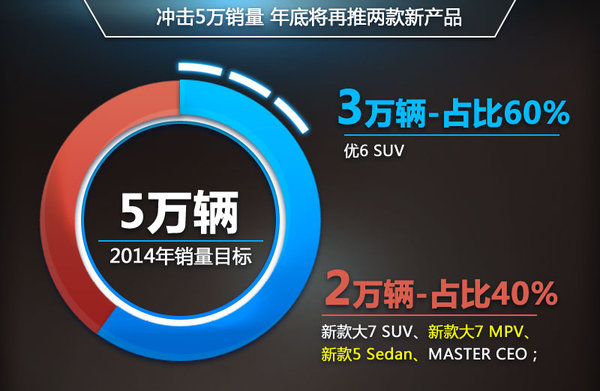 有東風(fēng)裕隆內(nèi)部人士透露:“今年我們的銷量將會有很大的提升,目前杭州工廠已進(jìn)入滿負(fù)荷工作狀態(tài),一周只休息一天,員工都在加班加點(diǎn)的生產(chǎn)新車!睂脮r通過新款大7 SUV、優(yōu)6 SUV、新大7 MPV、5 Sedan等年內(nèi)所推出的4款新車型,實(shí)現(xiàn)5萬輛的銷售目標(biāo)并非難事。(網(wǎng)通社 2014年8月18日 北京發(fā)布)