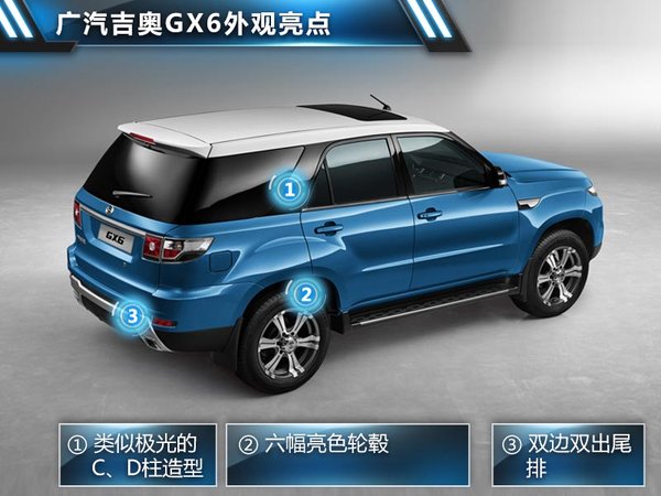 廣汽吉奧GX6的車尾同樣與路虎極光十分相似,雖然沒有采用攬勝極光那樣的下溜式車頂,但卻采納了其色調(diào)跳躍的雙色車身。雙邊雙出形式的菱形排氣尾管,也是在攬勝極光略顯普通的圓筒式尾排造型上進(jìn)行了創(chuàng)新。此外,廣汽吉奧GX6車身上所配備的全新亮色輪轂也是一大亮點(diǎn)。