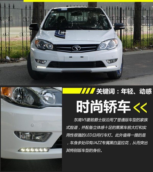 東南V5菱致爵士版沿用了普通版車型的家族式臉譜設(shè)計,前進氣格柵加入鋼琴漆黑涂讓整車立馬顯得“高大上”。值得一提的是,新車還配備有立體感十足的熏黑車前大燈和實用性很強的LED日間行車燈。而車身多處印有“JAZZ”專屬黑白藍拉花則突出了其特別版車型的身份。