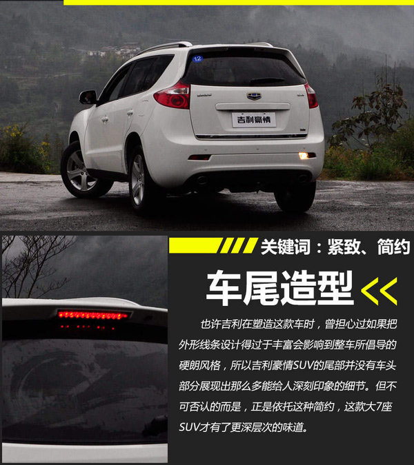 也許吉利在塑造這款車時(shí),曾擔(dān)心過(guò)如果把外形線條設(shè)計(jì)得過(guò)于豐富會(huì)影響到整車所倡導(dǎo)的硬朗風(fēng)格,所以吉利豪情SUV的尾部并沒(méi)有車頭部分展現(xiàn)出那么多能給人深刻印象的細(xì)節(jié)。但不可否認(rèn)的而是,正是依托這種簡(jiǎn)約,這款大7座SUV才有了更深層次的味道。