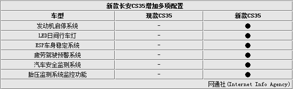新款CS35新增了發(fā)動機啟停系統(tǒng),這套系統(tǒng)的“智能”體現(xiàn)在發(fā)動機在暫時停車時能自動熄火,而在駕駛員抬起剎車踏板后自動重啟發(fā)動機,相比普通發(fā)動機更為節(jié)能。在堵車已是“家常便飯”的大城市,這項配置顯然非常實用。而這項配置目前在國內(nèi)自主、合資品牌中都不多見。此外,新車還新增了LED日間行車燈、ESP車身穩(wěn)定系統(tǒng)、疲勞駕駛預(yù)警系統(tǒng)、汽車安全監(jiān)測系統(tǒng)、胎壓監(jiān)測系統(tǒng)監(jiān)控功能等多項配置。