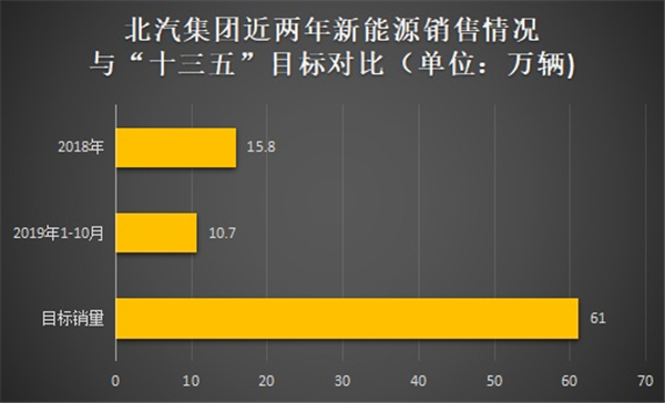 北汽集團(tuán)新能源車(chē)在2018年共銷(xiāo)售15.8萬(wàn)輛,同比增長(zhǎng)56.6%,在純電市場(chǎng)銷(xiāo)量連續(xù)第六年領(lǐng)先。2019年1-10月,北汽新能源車(chē)?yán)塾?jì)銷(xiāo)售10.70萬(wàn)輛,同比下降2.42%,僅為2020年61萬(wàn)輛目標(biāo)的17.54%。