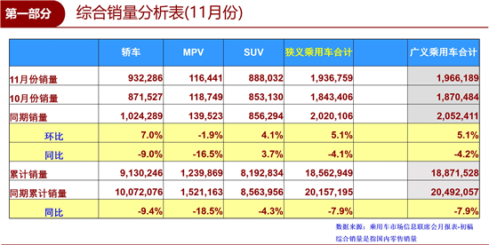 昨日(12月9日),乘用車市場(chǎng)信息聯(lián)席會(huì)(以下簡稱“乘聯(lián)會(huì)”)發(fā)布數(shù)據(jù)顯示:11月,我國狹義乘用車銷量達(dá)到1936759輛,環(huán)比上漲5.1%,同比下滑4.1%,下滑幅度繼續(xù)小幅收窄;推動(dòng)1-11月累計(jì)銷量同比下滑進(jìn)一步收縮至7.9%,達(dá)到18562949輛。