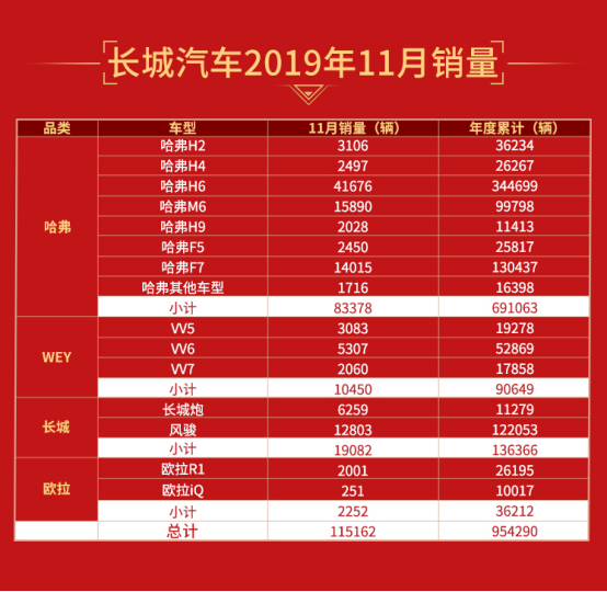 近日,長城汽車(000625)發(fā)布2019年11月銷量數(shù)據(jù)。今年11月,長城汽車銷量穩(wěn)中有進,銷售新車115162輛,環(huán)比增長0.13%,其中哈弗、WEY、歐拉和長城皮卡分別銷售83378輛、10450輛、2252輛和19062輛。1-11月,長城汽車累計銷售新車達954290輛,同比增長3.81%,2019年銷量目標已達成89.2%。