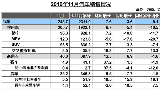 具體來看,11月汽車產(chǎn)銷量分別完成259.3萬輛和245.7萬輛,環(huán)比分別增長13%和7.6%,產(chǎn)量同比增長3.8%,銷量同比下降3.6%,銷量同比降幅比上月收窄0.5個百分點。