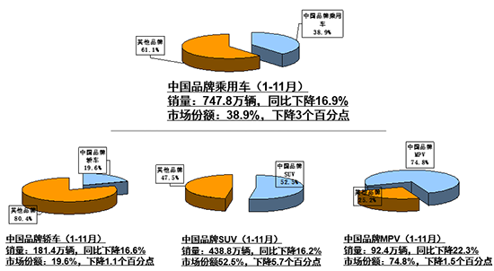 分國別來看,11月自主品牌乘用車銷量為80.6萬輛,同比下降11.4%,市場份額39.2%,同比下降2.7個百分點;1-11月,自主品牌乘用車共銷售747.8萬輛,同比下降16.9%,市場份額38.9%,同比下降3個百分點。其中自主品牌轎車、SUV和MPV市場占有率分別為19.6%、52.5%和74.8%,較去年同期分別下降1.1個百分點、5.7個百分點和1.5個百分點。陳士華表示,“作為我們關(guān)注的重點,中國品牌乘用車市場占比曾在8-10月出現(xiàn)上升趨勢,本月再次出現(xiàn)下滑顯然不是一個好現(xiàn)象。”
